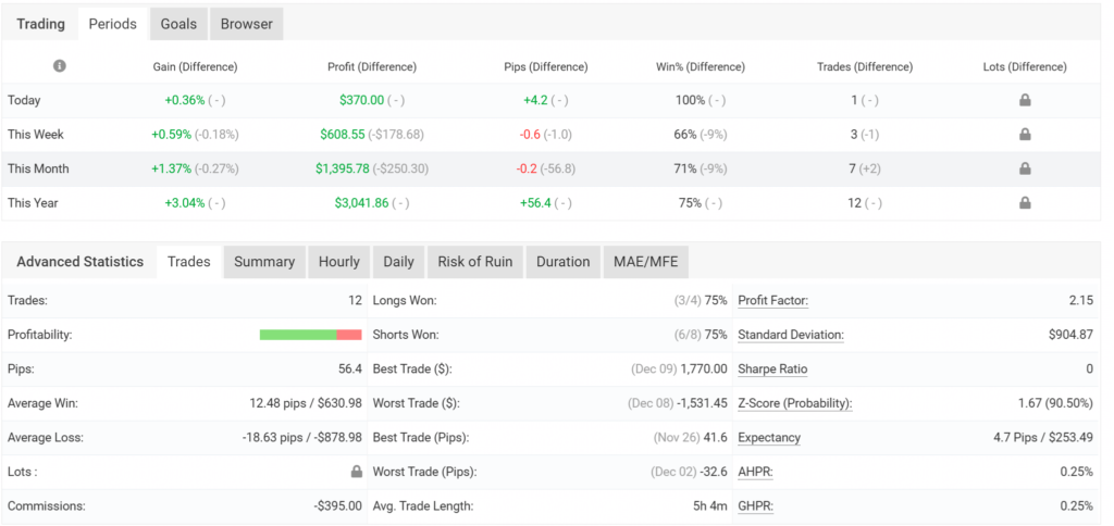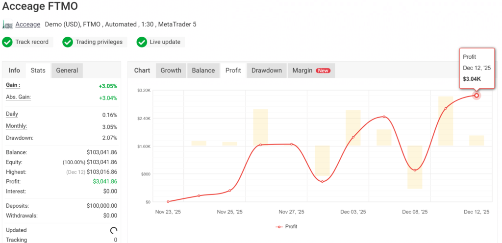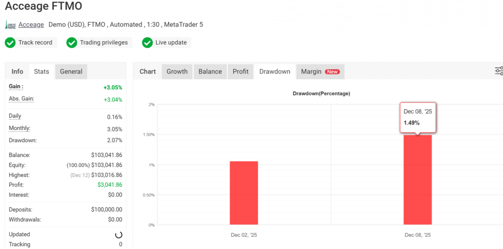 PERFORMANCE Home > Performance Click To Watch One of Our FTMO Account Live On MyFxBook — Started on Nov 24, 2025 with $100,000 in capital. Our target is to achieve 10% growth within the next two weeks, if not sooner; 7% left. Drawdown is an essential part of trading, and ours is only 1.49%, while we are allowed up to 10%. This shows how safely and conservatively we manage the account. Cash Account